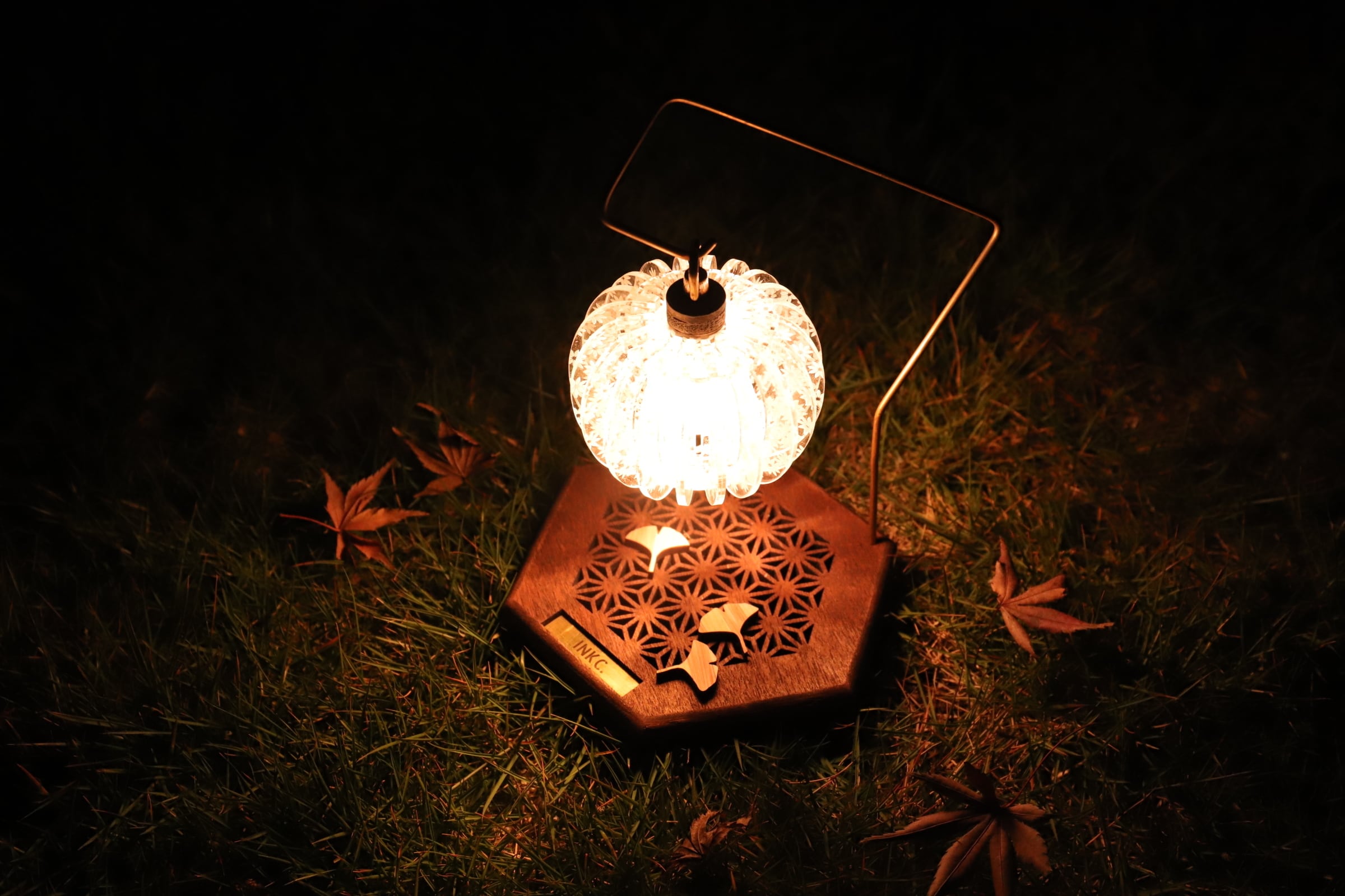 CALM Lantern 専用スタンド ※スタンドのみの販売となります。 ●ランタンスタンドの天板には組み木細工の模様を刻印しております。(模様変更可能) 使用材料 ・真鍮 ・ベニヤ板 ライト本体は充電式です。