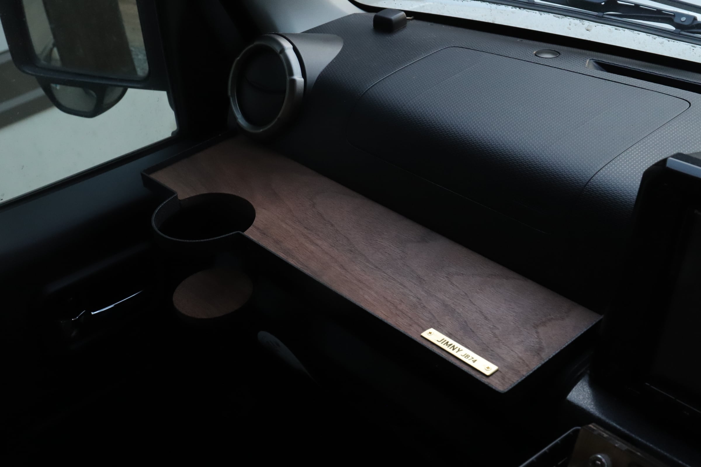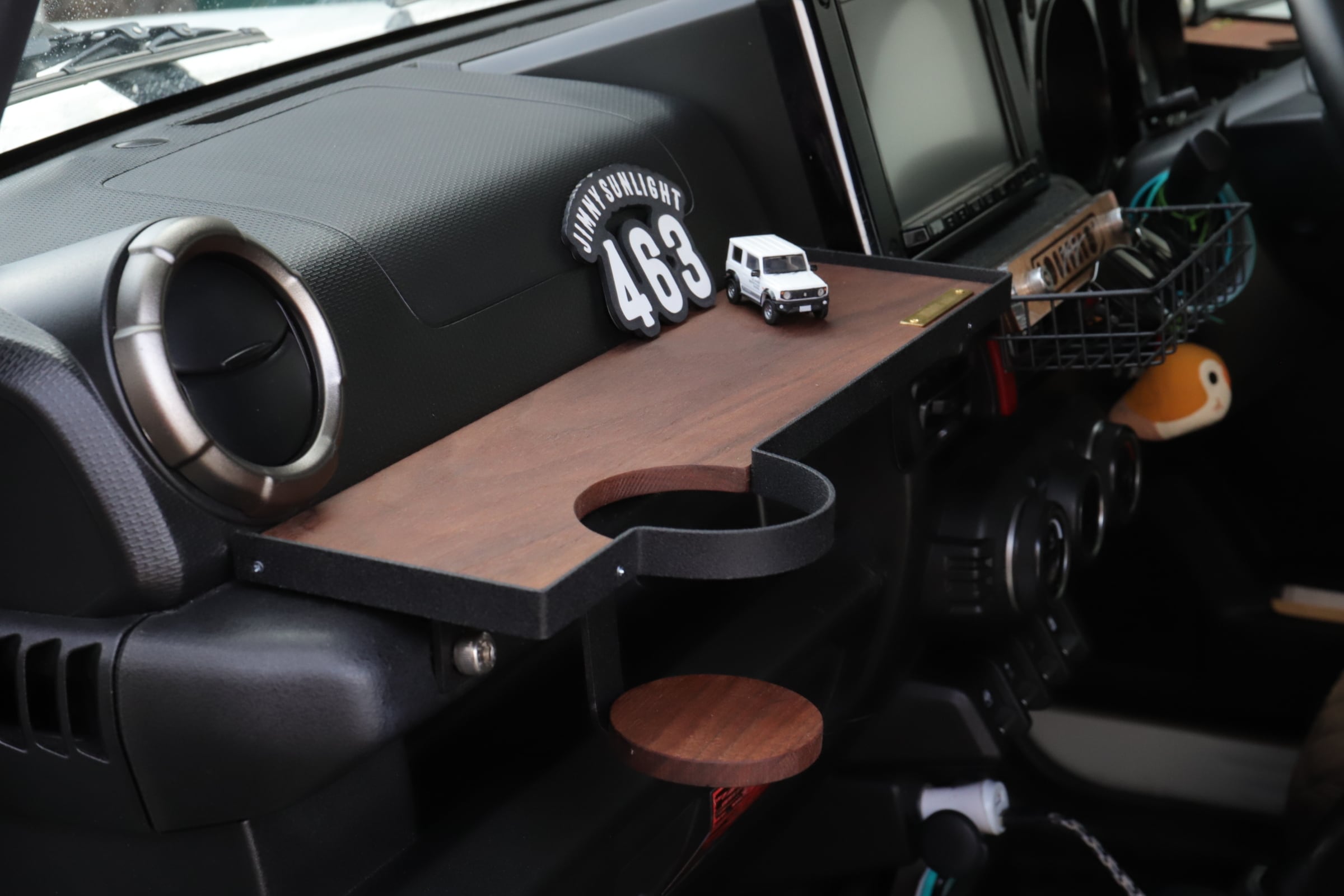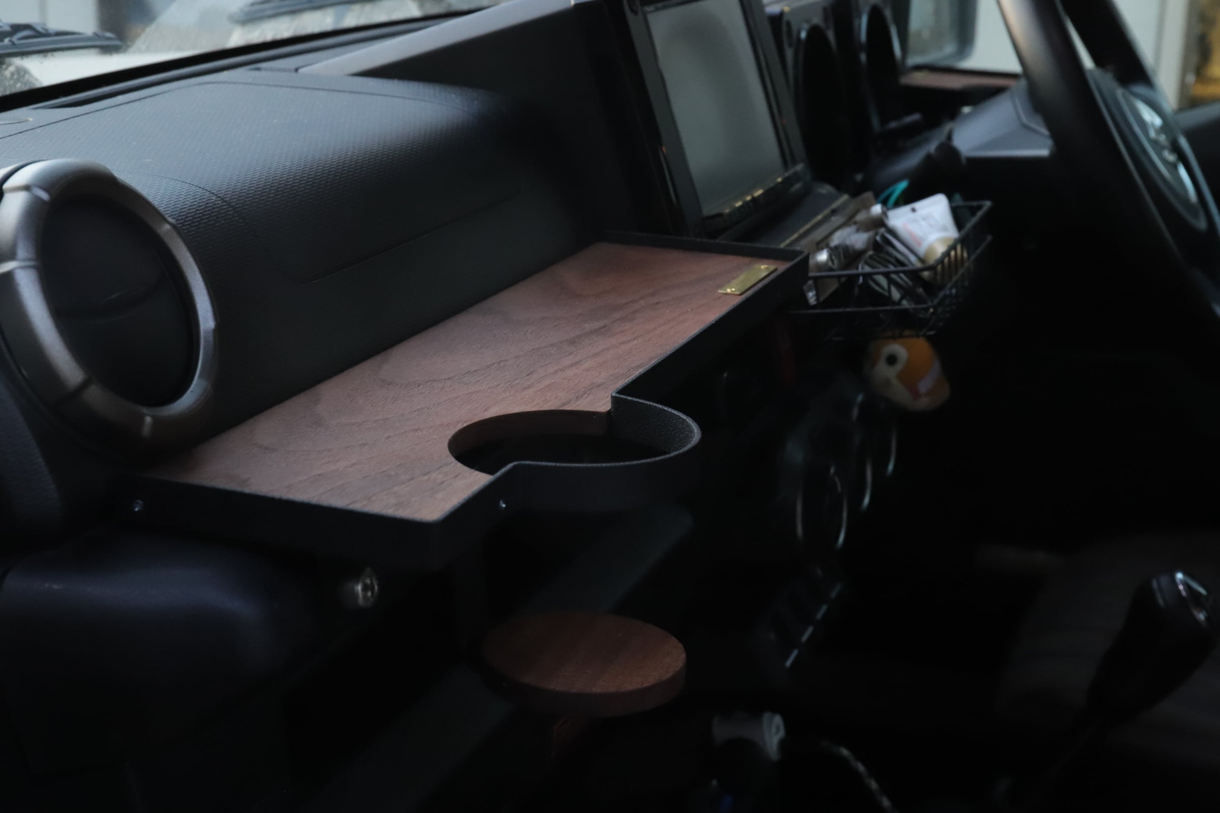 ■アルミニウムとウォルナットを使用した助手席用フロントテーブルになります。アルミニウムを使用する事でサビが出ず、強度を保ったまま軽量で製作できます。